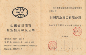·2007年3月,日照市企業(yè)信用評價(jià)工作委員會評審認(rèn)定興業(yè)集團(tuán)為“山東省日照市AAA級信用企業(yè)”