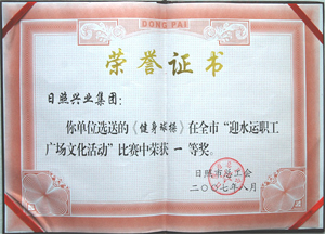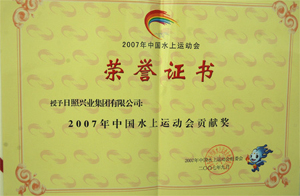 ·2007年9月,中國水上運(yùn)動會組委會授予日照興業(yè)集團(tuán)有限公司“中國水上運(yùn)動會貢獻(xiàn)獎(jiǎng)”