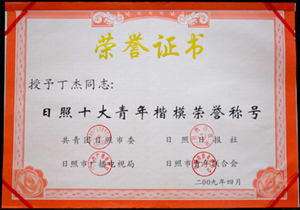 ·2009年,丁杰董事長獲得“日照十大青年楷模榮譽稱號”