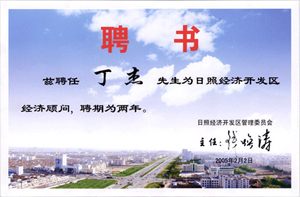 · 2005年2月2日,茲聘任丁杰董事長(zhǎng)日照經(jīng)濟(jì)開發(fā)區(qū)經(jīng)濟(jì)顧問
